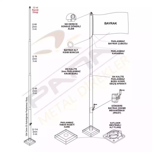 12 metre profesyonel bayrak direği ürünümüzde 360°Sonsuz Döner Tepe, Bayrak Boncuğu, İp Sarma Mekanizması(Irgat,Patentli Ürün), Taban Rozeti(Kare), Menteşeli Flanş ve Ankaraj Malzemeleri bulunmaktadır. Bayrak ürüne dahil değildir.