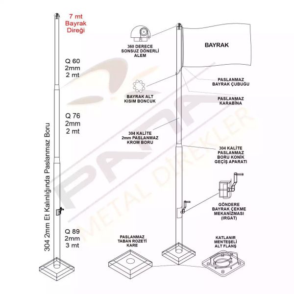 7 metre standart bayrak direği ürünümüzde 360°Sonsuz Döner Tepe, Bayrak Boncuğu, İp Sarma Mekanizması(Irgat,Patentli Ürün), Taban Rozeti(Kare), Menteşeli Flanş ve Ankaraj Malzemeleri bulunmaktadır. Bayrak ürüne dahil değildir.