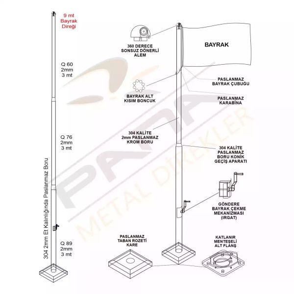 9 metre profesyonel bayrak direği ürünümüzde 360°Sonsuz Döner Tepe, Bayrak Boncuğu, İp Sarma Mekanizması(Irgat,Patentli Ürün), Taban Rozeti(Kare), Menteşeli Flanş ve Ankaraj Malzemeleri bulunmaktadır. Bayrak ürüne dahil değildir.