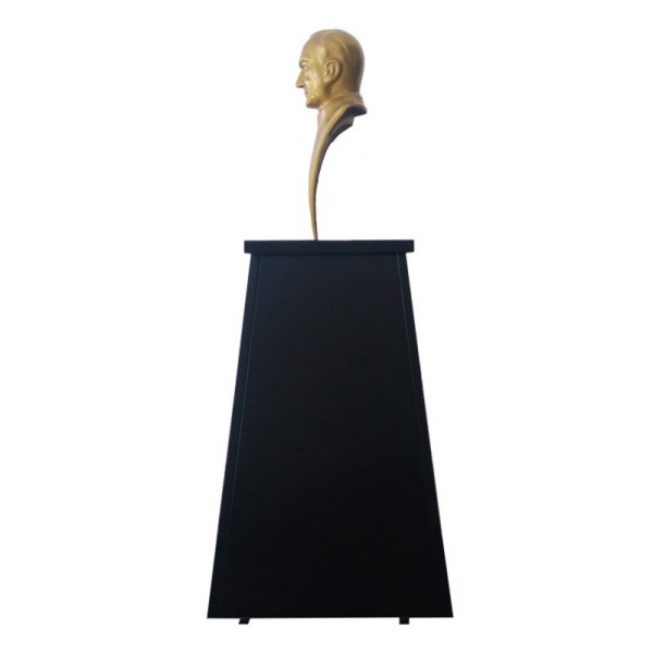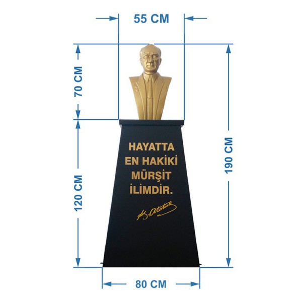 Atatürk Büstü kaidesi olarak imal ettiğimiz bu modelin çift taraflı paslanmaz galvaniz sac üzerine elektrostatik fırın boya yapılmıştır . Alt kısmında yere montajıda yapılabilen hazır kaide modelinin, üzerindeki yazı gold renginde folyo harf den istenilen metin yazılacaktır. Üst kısımdaki Atatürk Büstü 70 cm yüksekliğinde profesyonel modeldir.