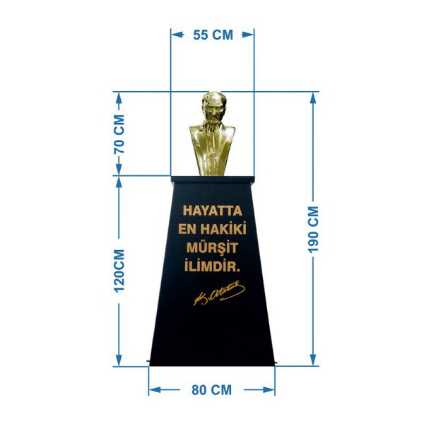 Atatürk Büstü kaidesi olarak imal ettiğimiz bu modelin çift taraflı paslanmaz galvaniz sac üzerine elektrostatik fırın boya yapılmıştır . Alt kısmında yere montajıda yapılabilen hazır kaide modelinin, üzerindeki yazı gold renginde folyo harf den istenilen metin yazılacaktır. Üst kısımdaki Atatürk Büstü 100 cm yüksekliğinde profesyonel modeldir.