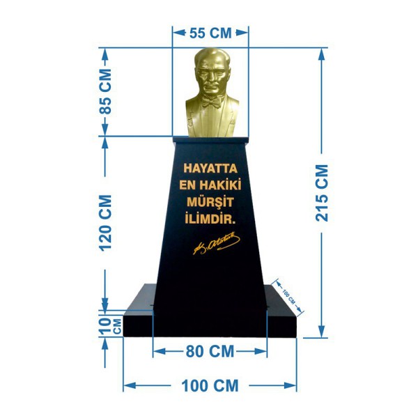Atatürk Büstü kaidesi olarak imal ettiğimiz bu modelin çift taraflı paslanmaz galvaniz sac üzerine elektrostatik fırın boya yapılmıştır . Alt kısmında yere montajıda yapılabilen hazır kaide modelinin, üzerindeki yazı gold renginde folyo harf den istenilen metin yazılacaktır. Üst kısımdaki Atatürk Büstü 85 cm yüksekliğinde profesyonel modeldir.