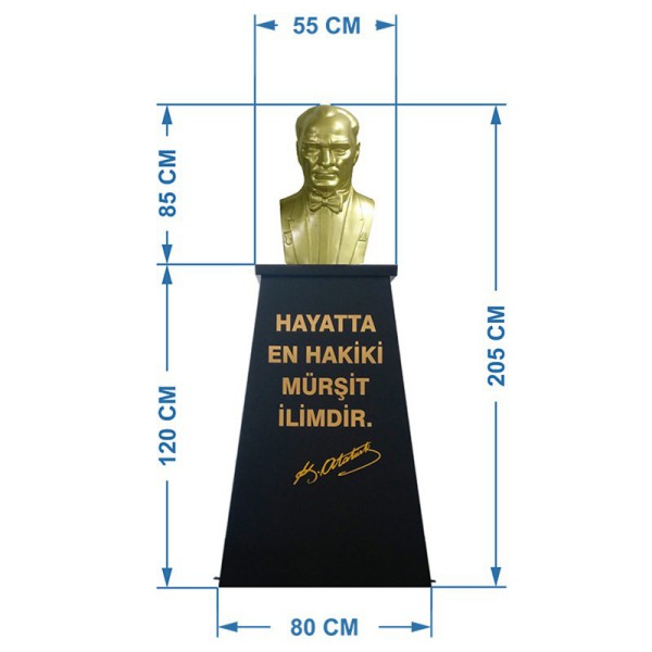 Atatürk Büstü kaidesi olarak imal ettiğimiz bu modelin çift taraflı paslanmaz galvaniz sac üzerine elektrostatik fırın boya yapılmıştır . Alt kısmında yere montajıda yapılabilen hazır kaide modelinin, üzerindeki yazı gold renginde folyo harf den istenilen metin yazılacaktır. Üst kısımdaki Atatürk Büstü 85 cm yüksekliğinde profesyonel modeldir.