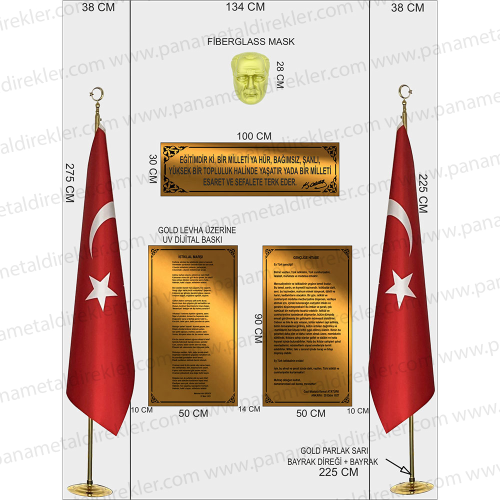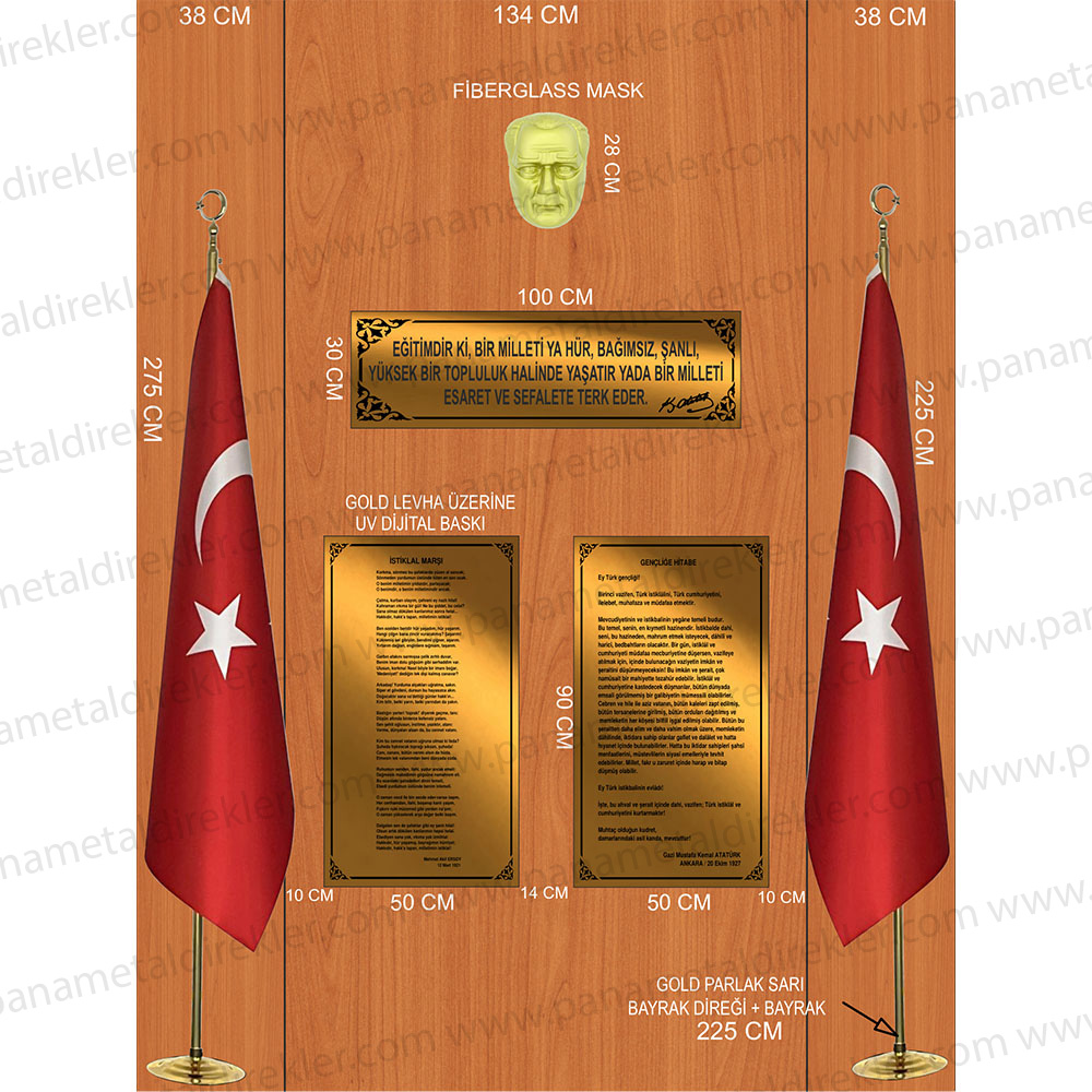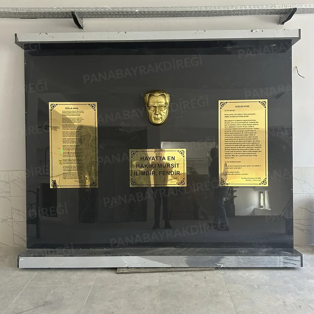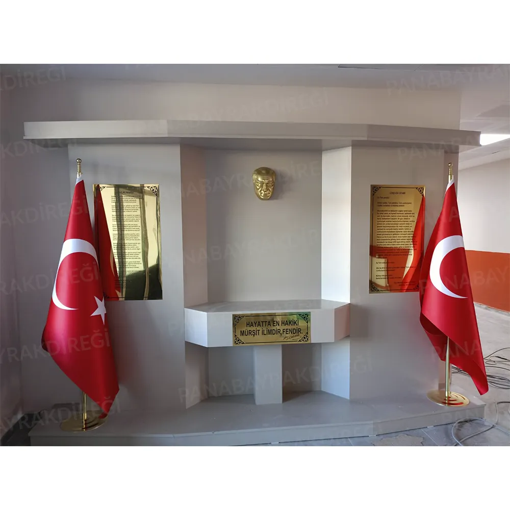 İstenilen özelliklere sahip Atatürk köşesi ürünleri, okullar, kamu kurumları, belediyeler, özel kuruluşlar ve ofislerde Atatürk’ü ve onun ilke ve inkılaplarını yaşatmak amacıyla kullanılmaktadır. İstiklal Marşı ve Gençliğe Hitabe levhaları, Atatürk’ün vizyonunu yansıtan vecizeleri ve maskı ile tamamlanan bu köşe, hem estetik hem de anlam derinliği taşıyan bir alan sunar. Paslanmaz gold levha üzerine UV baskı teknolojisi ile üretilen bu ürünler, uzun ömürlü ve dayanıklıdır. Bayrak direği ve bayrak setiyle birlikte tam bir takım olarak, özenle paketlenmiş bir şekilde sevk edilir.