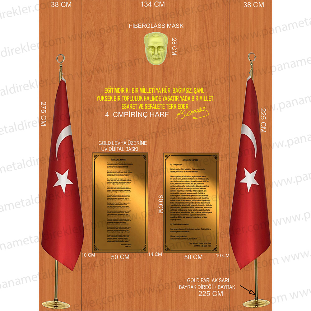 İstenilen özelliklere sahip Atatürk köşesi ürünleri, okullar, kamu kurumları, belediyeler, özel kuruluşlar ve ofislerde Atatürk’ü ve onun ilke ve inkılaplarını yaşatmak amacıyla kullanılmaktadır. İstiklal Marşı ve Gençliğe Hitabe levhaları, Atatürk’ün vizyonunu yansıtan vecizeleri ve maskı ile tamamlanan bu köşe, hem estetik hem de anlam derinliği taşıyan bir alan sunar. Paslanmaz gold levha üzerine UV baskı teknolojisi ile üretilen bu ürünler, uzun ömürlü ve dayanıklıdır. Bayrak direği ve bayrak setiyle birlikte tam bir takım olarak, özenle paketlenmiş bir şekilde sevk edilir.